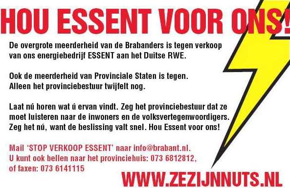 Ron Lodewijks schreef een mooie column in het Brabants Dagblad over de verkoop van Essent. Hoe gekozen politici geen verantwoorduing afleggen aan de kiezer over de beslissing van de eeuw: de verkoop van Essent aan het Duitse RWE. Een beslissing die overigens met een week is uitgesteld.