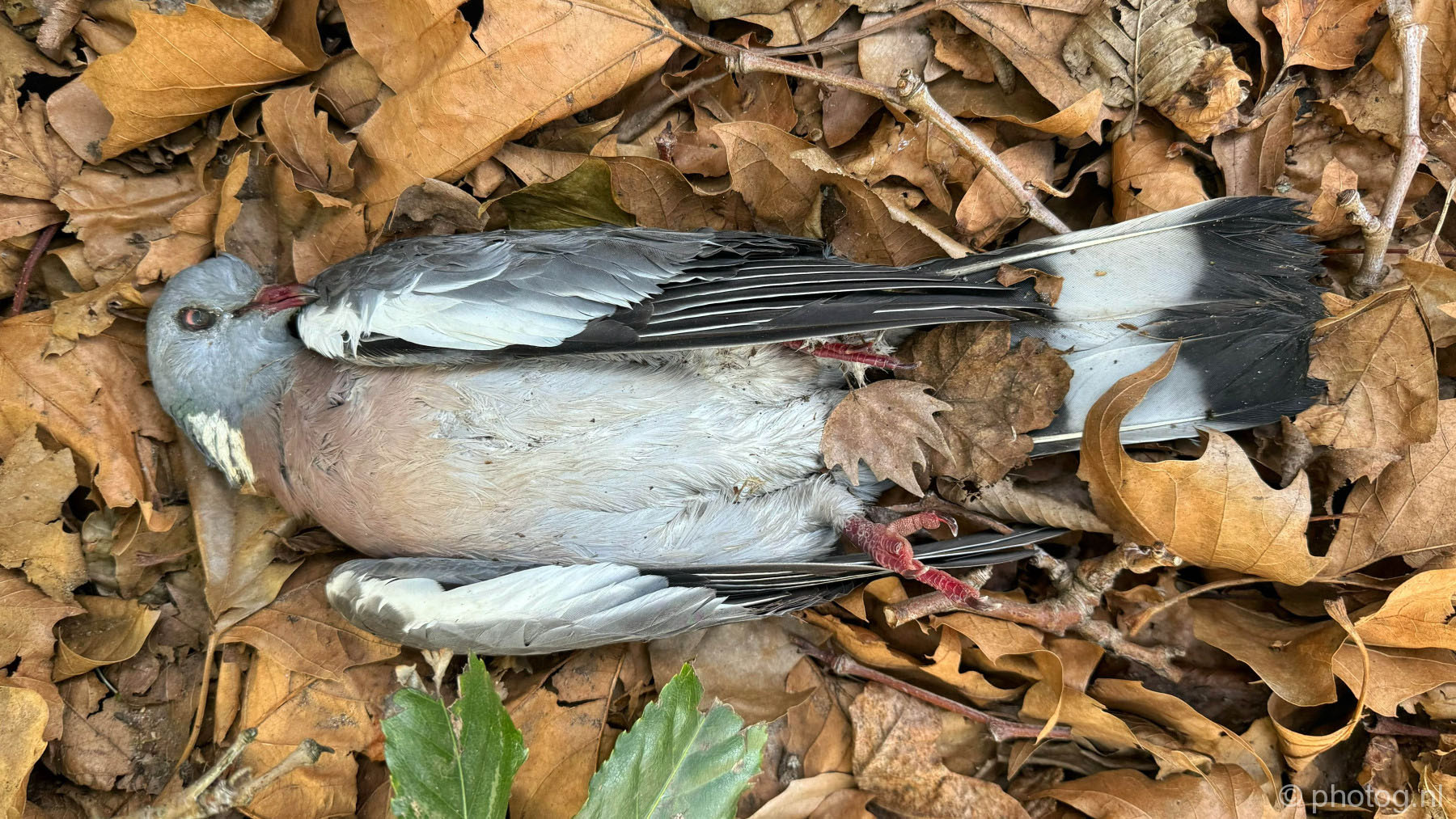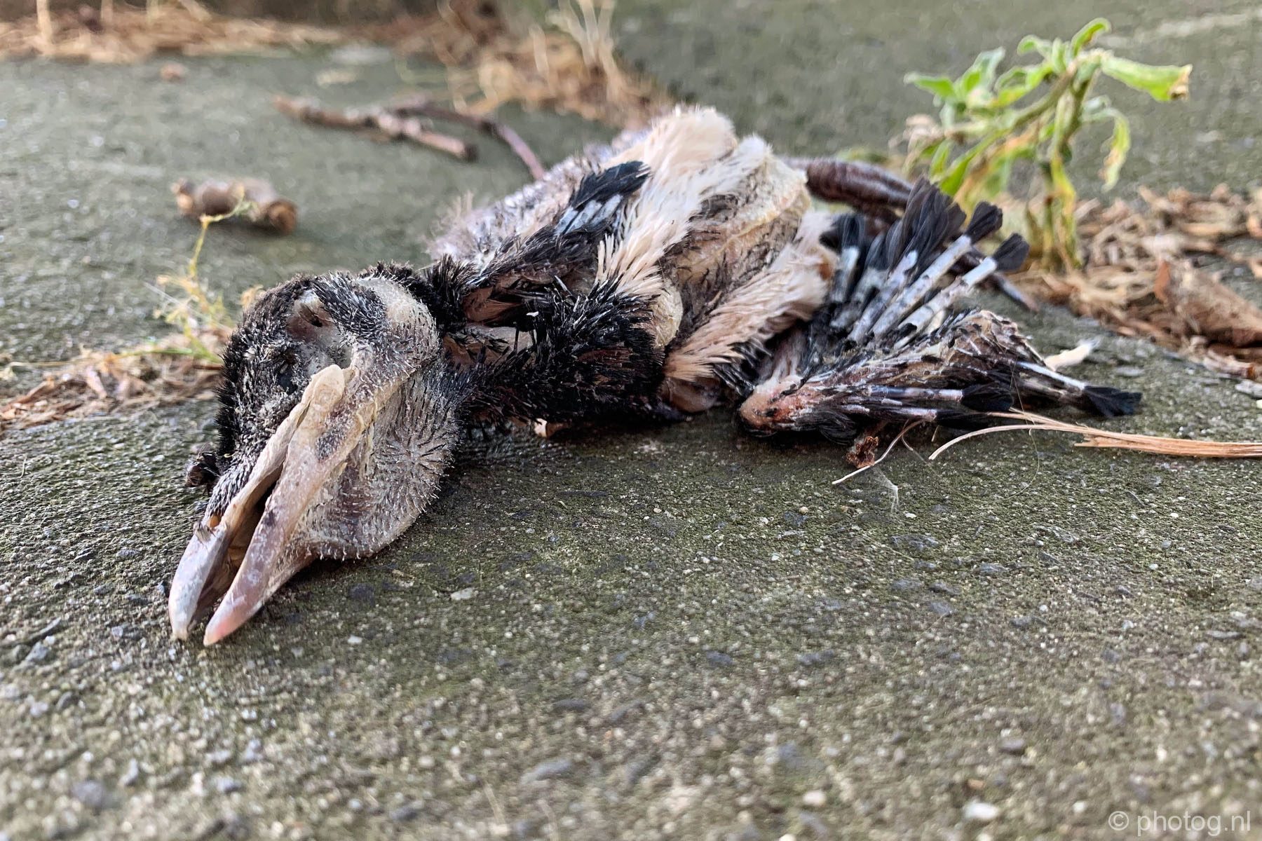 En daar lag weer een dode vogel voor incassobureau Flanderijn aan de Rotterdamse ‘s-Gravendijkwal. Een kleine bonte specht dit keer. Op zijn rug, ogen dicht, zijn grote spitse snavel stak omhoog.