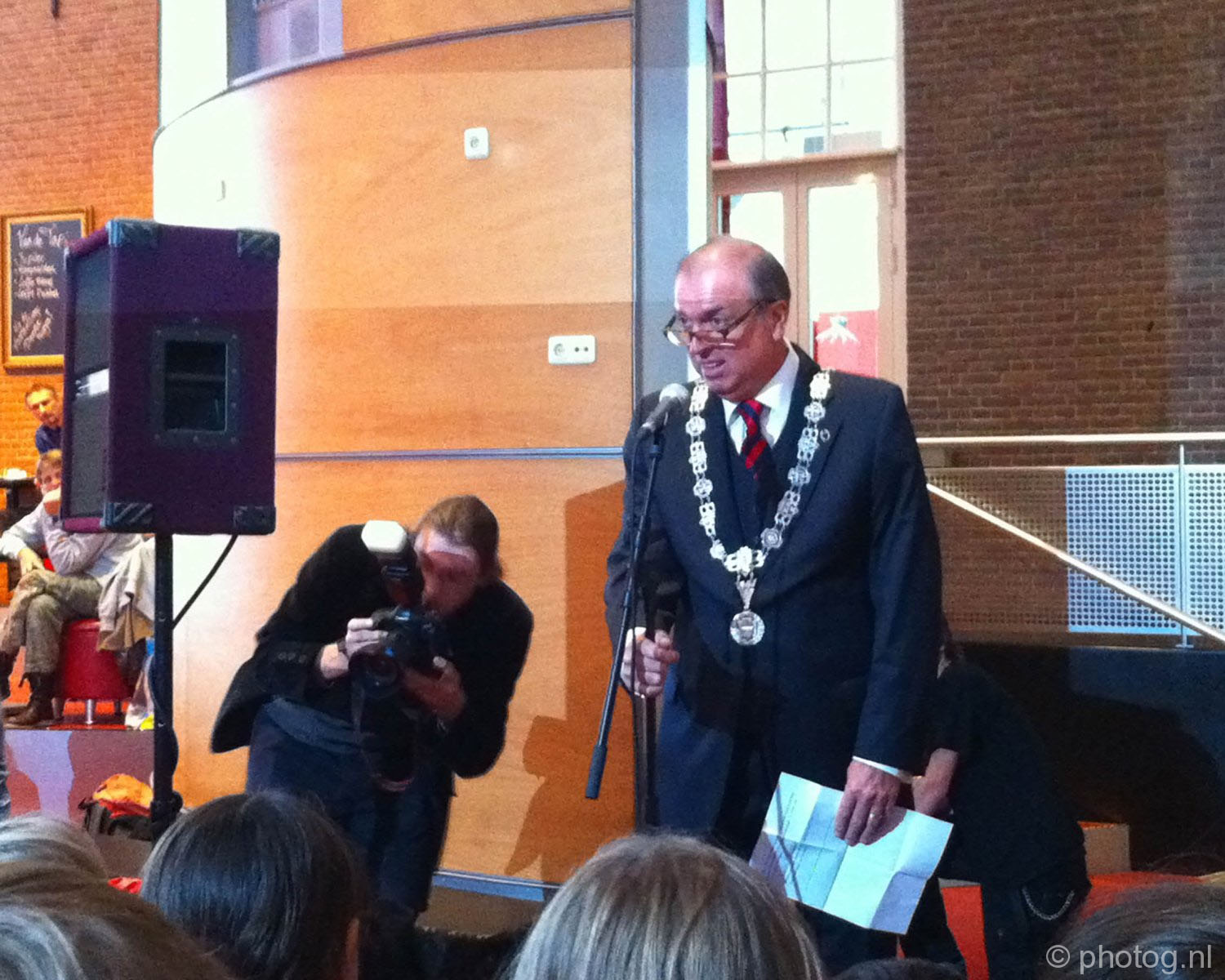 Burgemeester Peter van der Velde opende warm en losjes de Jeugdtheaterdagen. De opening liep uit op een voorstelling op zich. Het één na het andere kind deed een kunstje naast de burgervader.