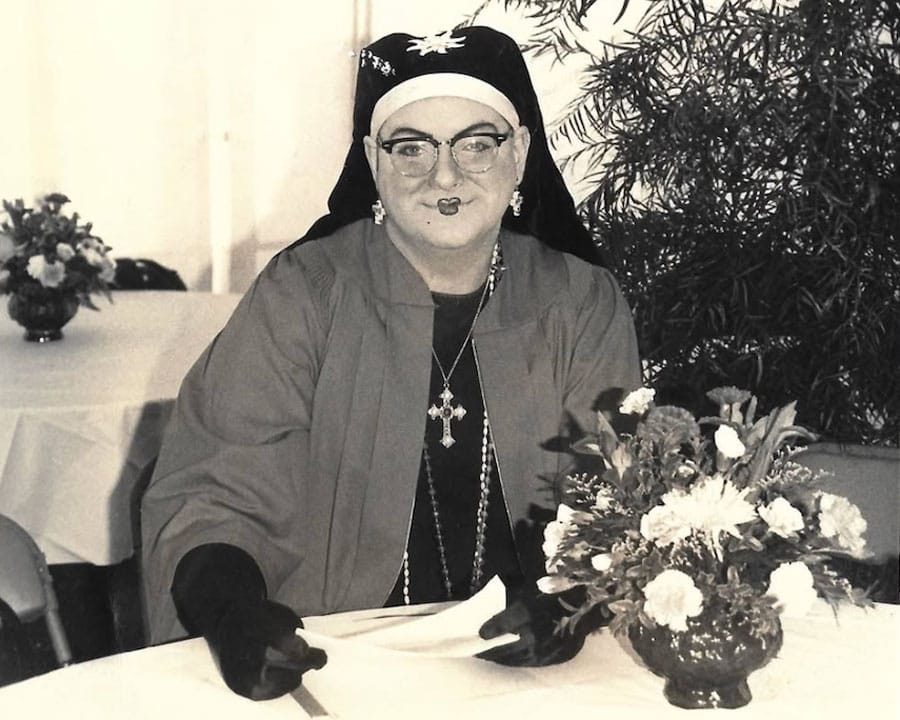 * Sister C (Garry Johnson) preceded the Sisters of Perpetual Indulgence and created a nursing nun character and ran a one-person campaign of safe-sex education and condom distribution in the 1980s. No photo credit or date.