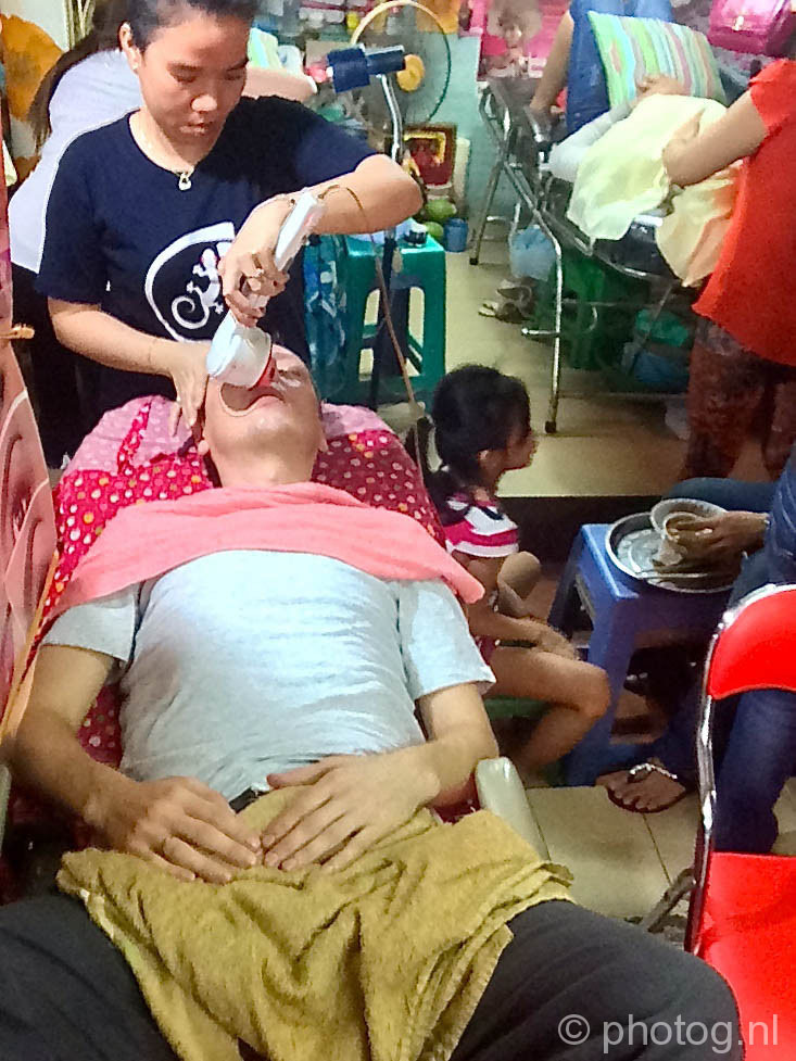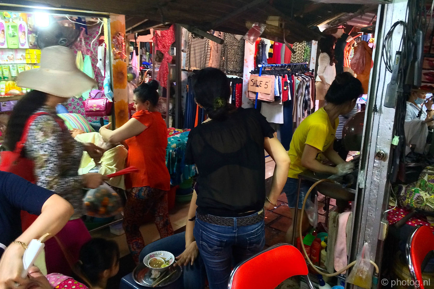 Alles is er ook goedkoper dan in de winkels. Je laat er voor een dollar kleren verstellen, voor een dollar eet je een lunch, een gezichtsmassage kost (met één consumptie) ongeveer vier dollar (€3,-). In Psah Kandal ziet dat er dan ongeveer zo uit: