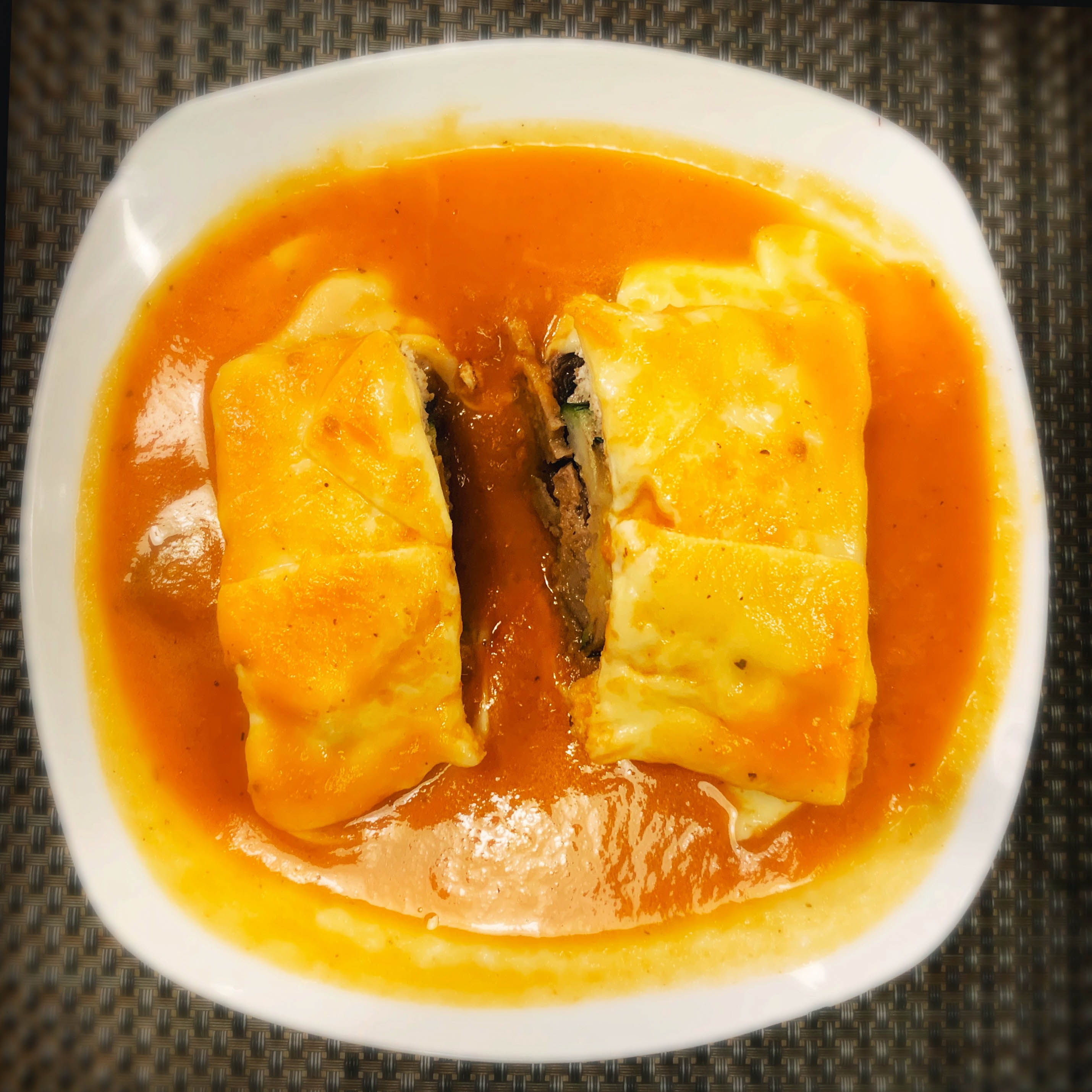 Maar ik moet het eerst hebben over het gerecht (als ik het zo mag noemen) met de mooie naam francesinha. Het is Portugees voor ‘kleine Fransoos’. Een Portugese arbeider die in België en Frankrijk woonde wilde de croque monsieur (tosti) naar Portugal brengen, maar maakte zijn eigen variant.