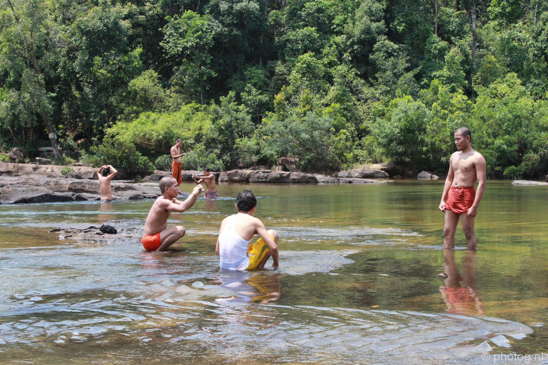 Er lagen nog maar twee andere bootjes en die hadden een hele familie en enkele toeristen afgeleverd, én een aantal boeddhistische monniken (al dan niet in opleiding) in fel oranje gewaden. Zowel de families als de monniken waren naar boven geklauterd om in het ondiepe gedeelte boven de waterval te baden.