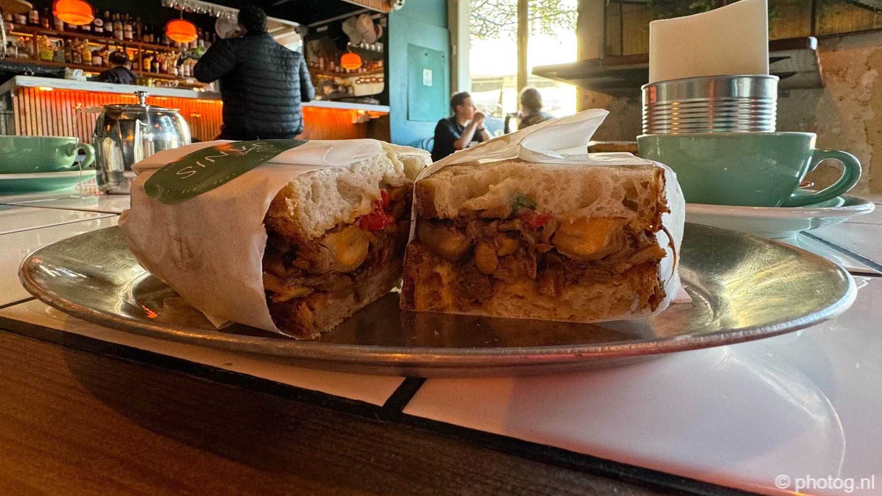 Een paar jaar geleden was het te druk in Café Janis, en nu was er plek genoeg, dus we namen een krukje, en ieder een sandwich. Eentje gevuld met Aziatisch gekruide (wat dat ook mag zijn) paddestoelen. De paddestoelen hadden nog een lekkere bite en de smaak was lekker. Azië is groot, ik heb geen idee uit welk land de kruideninspiratie kwam.