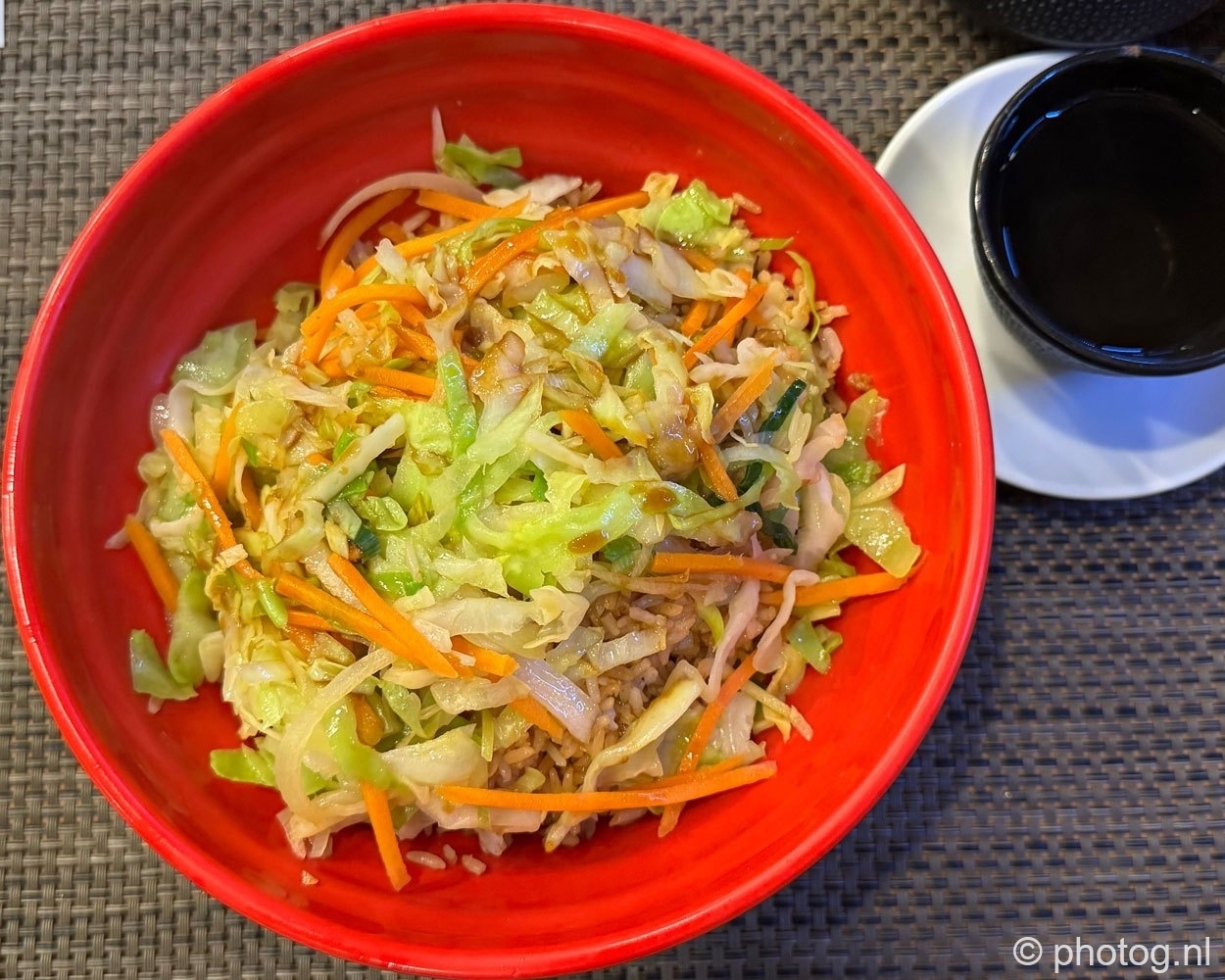 De dag van aankomst op Madeira waren we moe en kwamen we via Happy Cow uit bij Noodle King. Dichtbij, simpel, niet al te slechte recensies. Maar: desgevraagd bleek dat er vissaus is alle boedelgerechten zit. De sushi was met fruit en wat ze kon doen was gebakken rijst maken en het ei weglaten. En kennelijk ook de smaak.