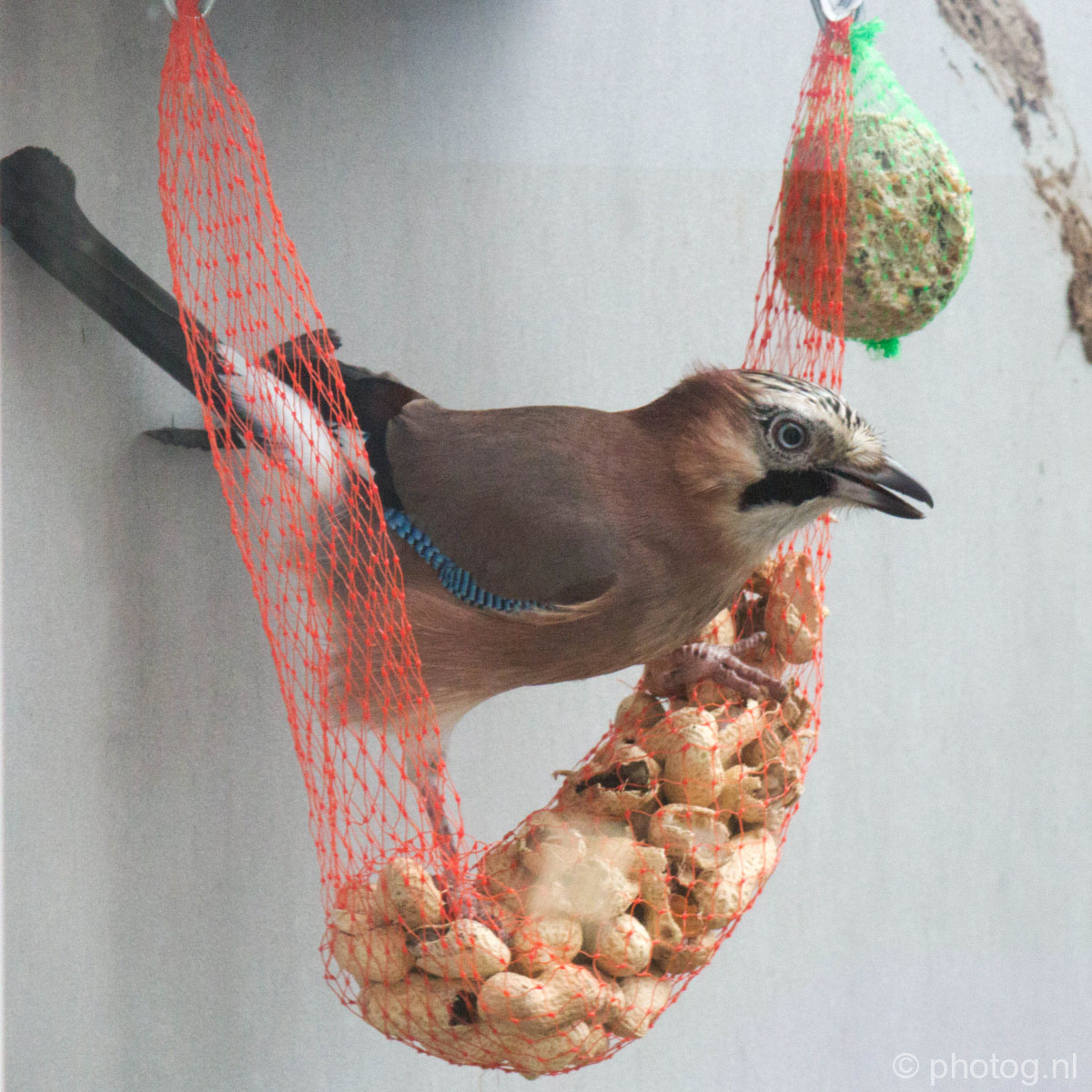 Officieel is het tegenwoordig ‘gaai’. Nadat de pindasnoer al diverse keren geplunderd was door een koppeltje gaaien, verscheen nummer drie vanochtend ten tonele: een jonkie.