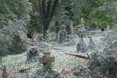 Boven: de joodse begraafplaats en onder: een begraafplaats die overwoekerd was met klimop.