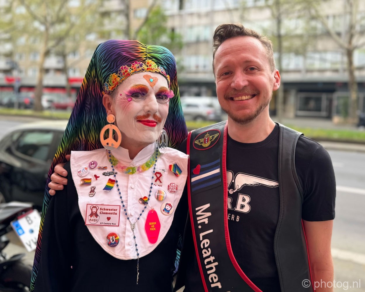Een paar dagen voor vertrek naar Berlijn kreeg ik een berichtje van Sr. Mary Read uit Poznan: Mr. Leather Netherlands was in Polen en vroeg zich af waarom er in Nederland geen Zusters waren. Lang verhaal kort: Zuster Clementia en Mr. Leather Netherlands (in het dagelijks leven Mees Vries) werden digitaal aan elkaar voorgesteld en zo vernam ik dat hij deze week óók in Berlijn zou zijn.